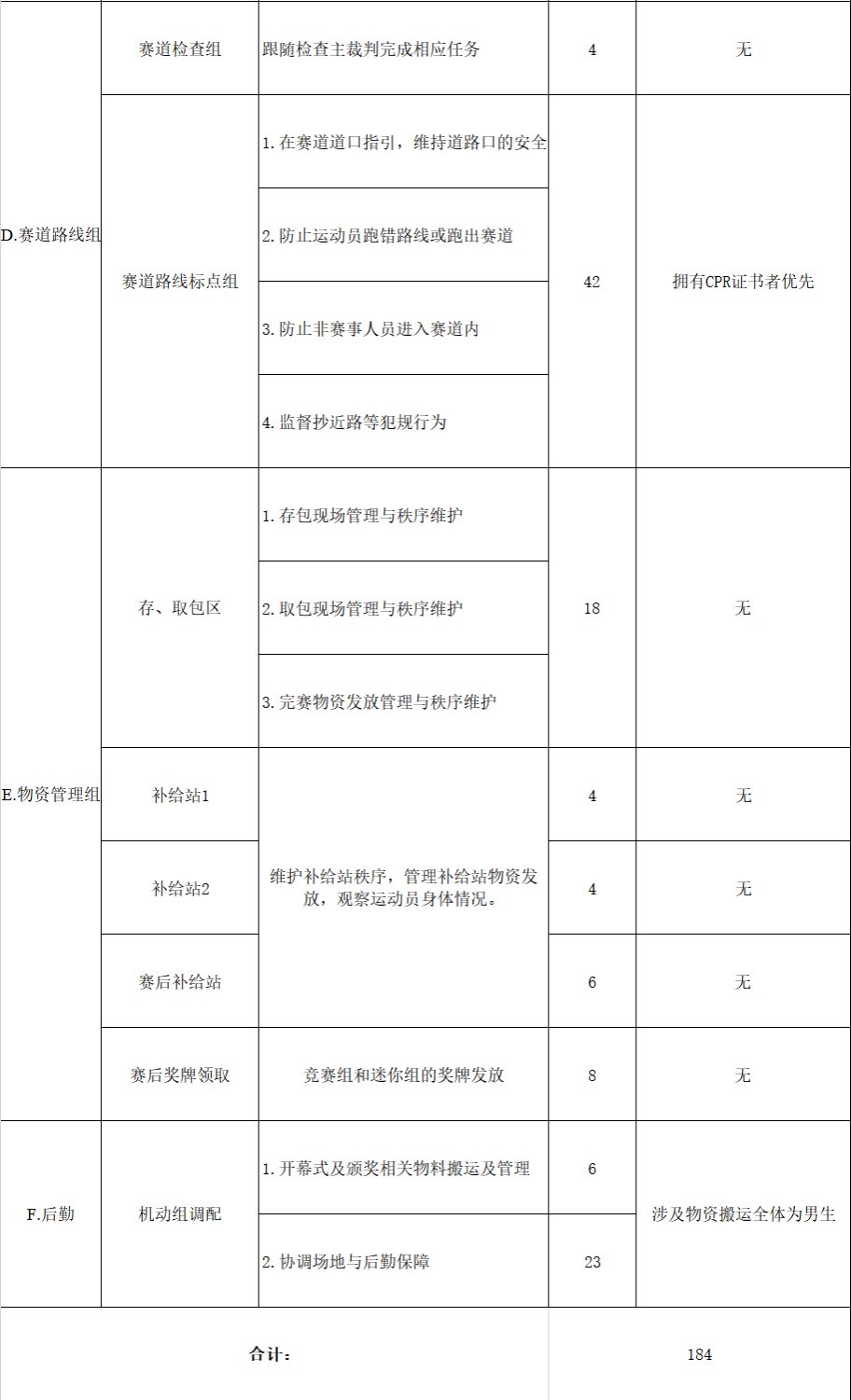 赛道检查组:46人(分流岔路口需配合裁判老师定岗,建议医疗志愿者优先)