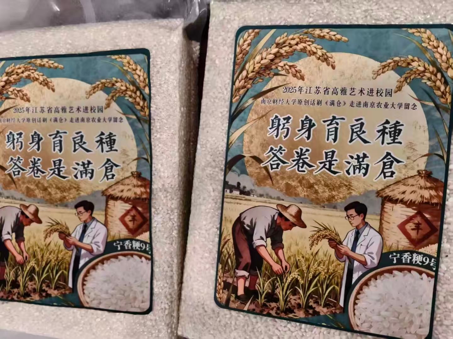 演出落幕之际,一幕温情而富有深意的场景将活动推向高潮——南京农业大学师生代表向《满仓》主创团队赠送了由我校万建民院士领衔培育的优质水稻品种“宁香粳9号”大米。这一粒粒饱满晶莹的大米,凝聚着南农科研团队的智慧与汗水,也象征着农业科研的“良种”与舞台艺术的“火种”在此刻交汇。舞台上动人的故事与手中沉甸甸的收获交相辉映,无声诠释着“躬身育良种,答卷是满仓”的深刻内涵。