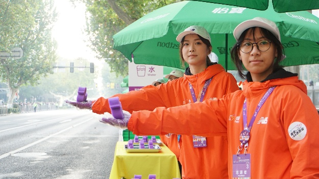 11月16日凌晨,120名志愿者准时抵达11公里补给点,迅速投入工作。他们分工明确,提前清点并有序摆放矿泉水、运动饮料、海绵等补给品,做好赛前准备。赛事期间,志愿者们高效完成物资递送,同时为跑者鼓掌助威,主动关注选手状态,为有需要的跑者提供针对性帮助。南京农业大学大三学生王泽宇第三次参与南马志愿服务,今年以补给站组长身份带领学弟学妹开展工作,凭借丰富经验保障服务高效推进;首次参与的班前锦同学,提前通过培训熟悉流程,在饮料区细致完成补给服务,用微笑传递温暖。赛事结束后,志愿者们快速规整剩余物资、清理现场杂物,确保补给点恢复整洁。