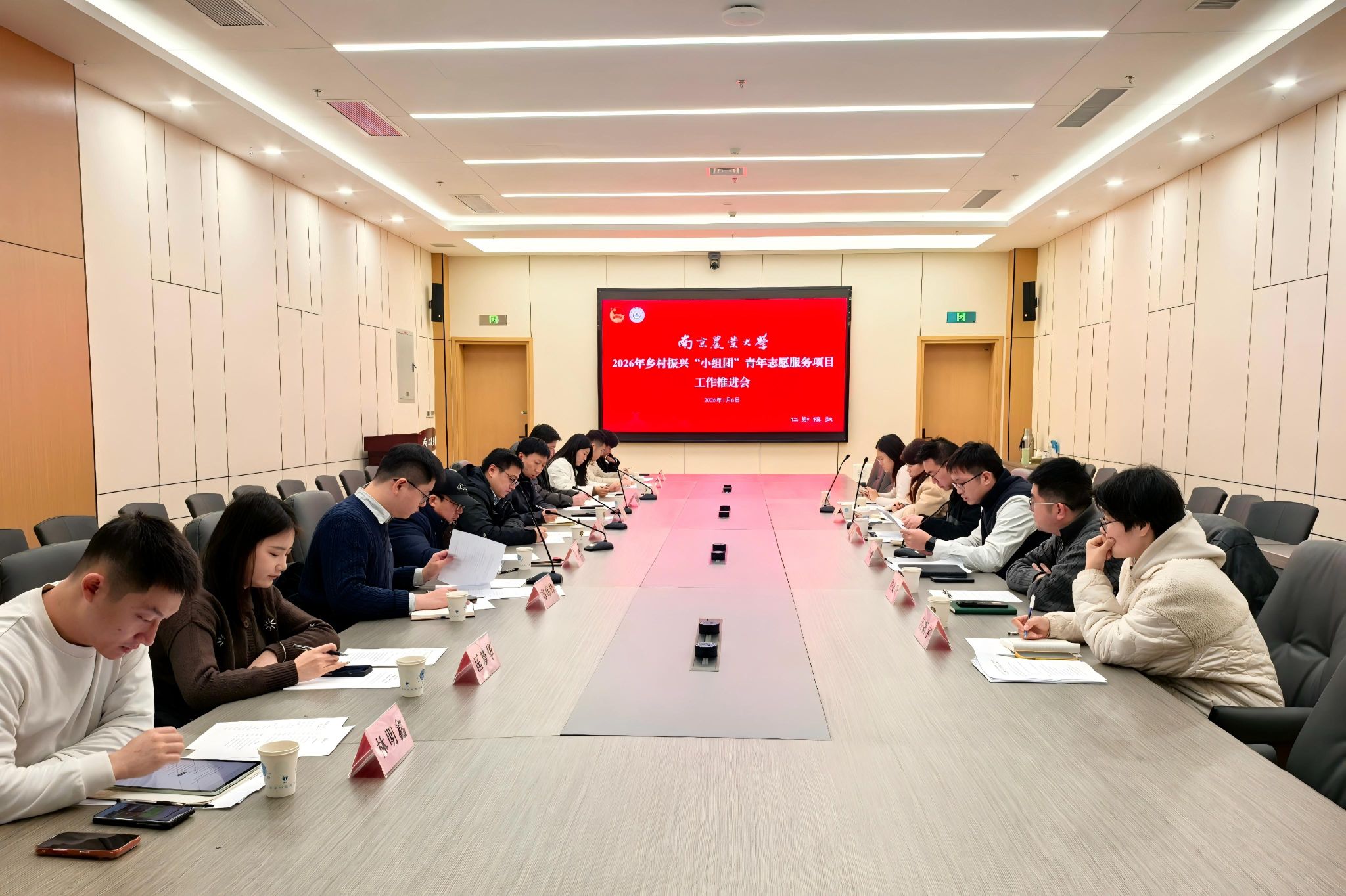 为持续深化乡村振兴“小组团”青年志愿服务项目实效,凝聚校地协同育人合力,2026年1月6日上午,南京农业大学团委于滨江校区召开了2026年乡村振兴“小组团”青年志愿服务项目工作推进会。校团委副书记方淦、资环院副院长张旭辉、园艺院教授王三红、理学院党委副书记冯绪猛、人文院教师苏伟锋以及相关学院专职团干部,团江宁区委社会联络部部长赵振强、溧水区志愿者行动指导中心主任殷中意、团新沂市委项目办负责人陆畅以及地方项目办工作人员等共同参会。
