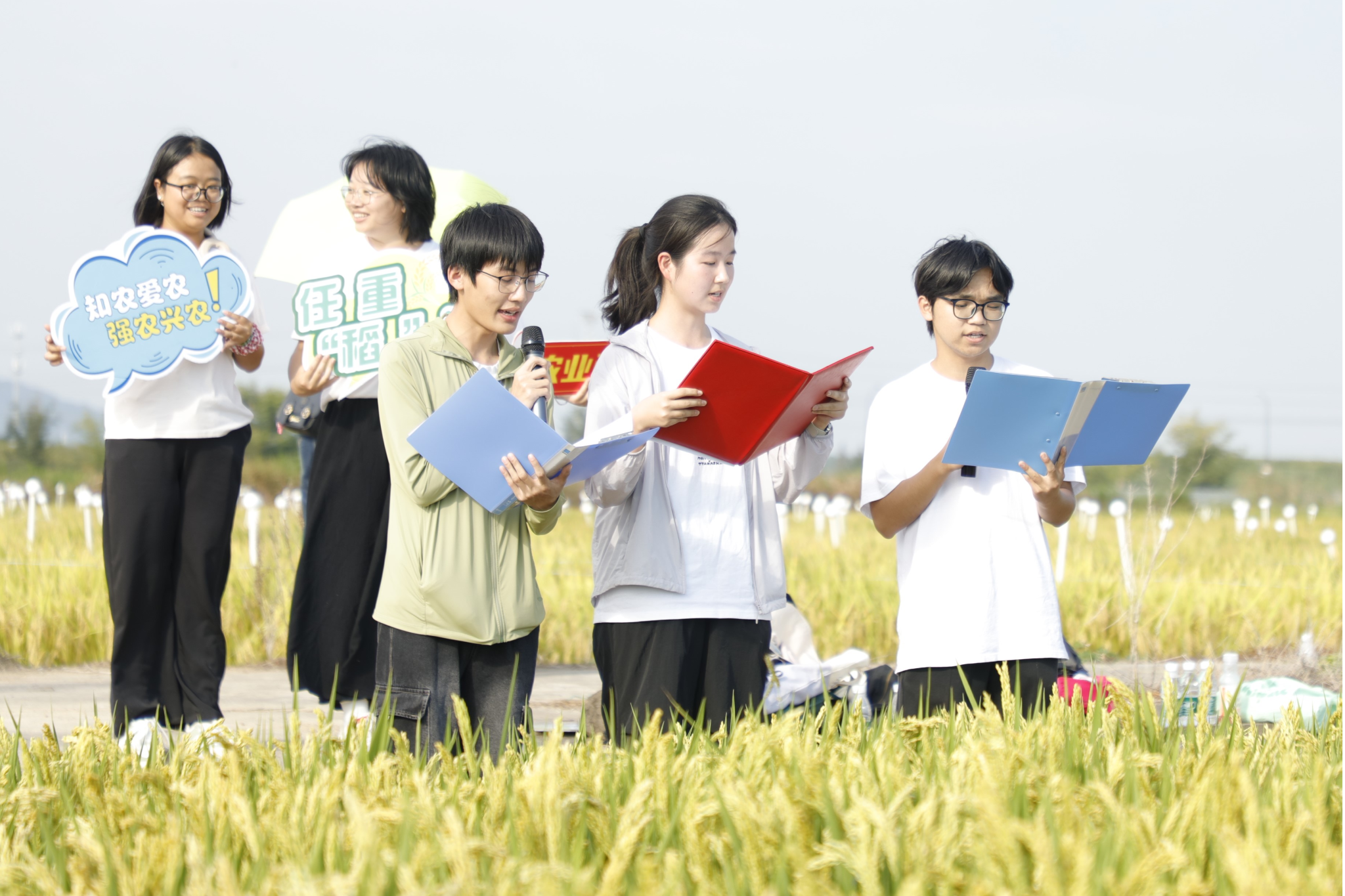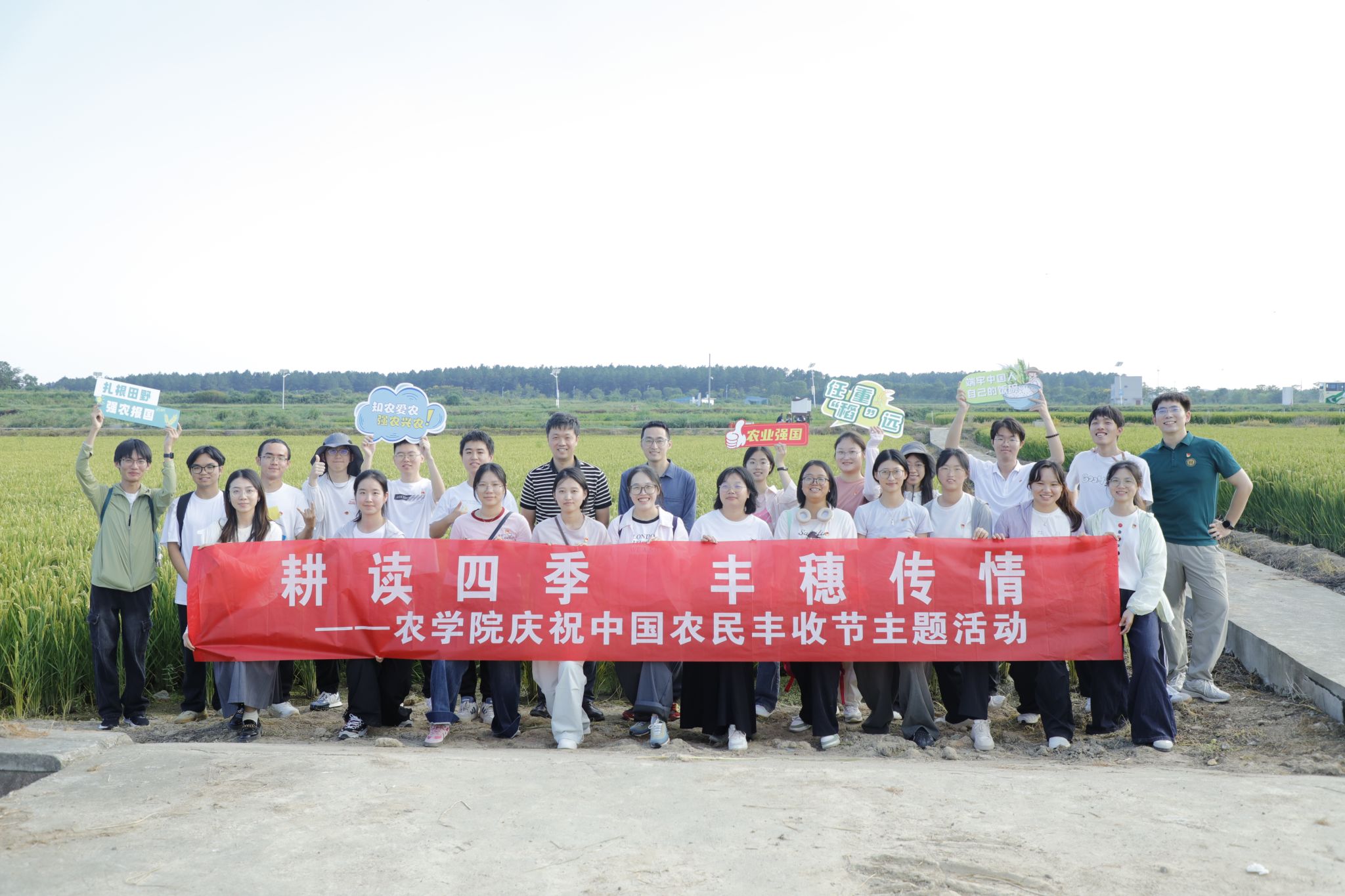“今天,我们站在田埂上,看,汗水滋养过的土地上,千万株稻穗弯下腰,把成长的故事,讲给大地听……”9月22日,在2025年中国农民丰收节到来之际,农学院本科、研究生以“耕耘四季·丰穗庆收”为主题,在自己耕作的水稻试验田中歌颂收获,唱响丰收,微风拂过田野,稻浪轻摆,田间地头上洋溢着“粮满仓”的喜悦。