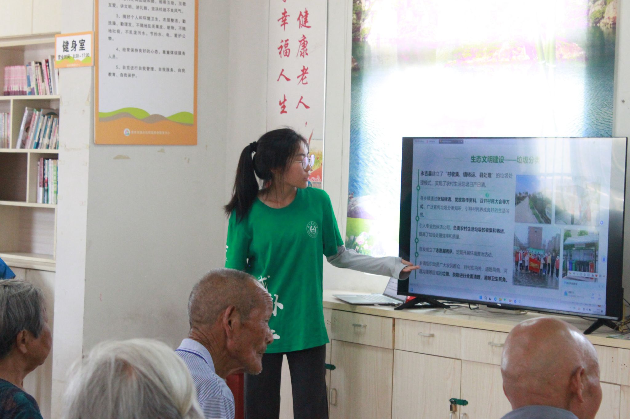 实践团依托向阳村居家养老服务中心大屏电视,开展“共享绿色家园”主题宣讲。通过生动的图文展示,向村民普及节水护水、净村美居与清洁能源知识。聚焦“绿动向阳,分类美好”,团员们详细拆解“两次四分法”垃圾分类技巧,现场老人感慨:“如今村里有了固定投放点,环境大变样!”