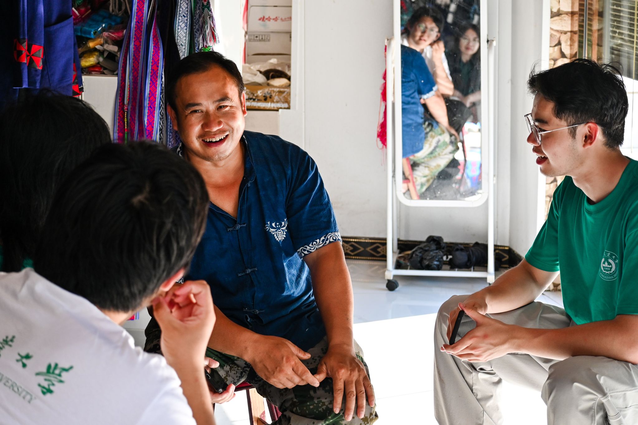 河坝村位于麻江县东部,瑶族村民占94%以上,是瑶族国家级非物质文化遗产枫香印染的发源地。在麻江县乡村振兴研究院办公室姜德松的带领下,实践团成员参观了建设中的枫香印染博物馆。非遗传承人、龙山镇河坝村委会主任龙全成为大家细致介绍河坝片区枫香印染技艺、瑶族服饰、瑶族婚俗、瑶年等代表性传承人的风采。随后,实践团跟随龙全成前往麻江瑶之韵成秀文化工坊进行参观,并深入访谈龙全成,了解南京农业大学驻村干部帮助河坝村建成首个“公司+工坊”非遗基地的故事。