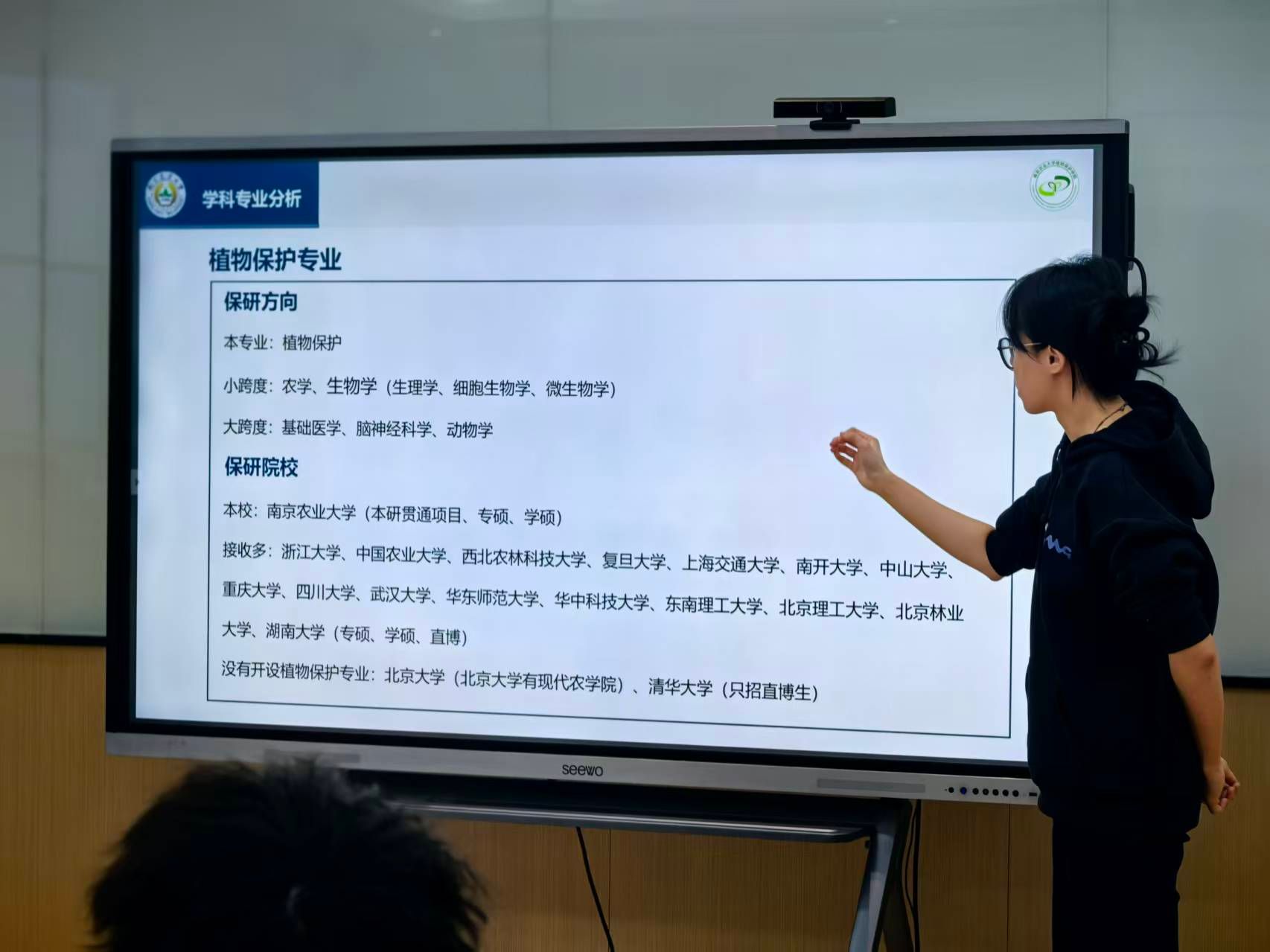 10月26日,植物保护学院保研经验交流会在17号楼206顺利举办,邀请到22级的三位优秀学长学姐,他们分别是成功推免至北大生科院的贾佳仪学姐、北大医学院的宋泽宇学长,以及南开化学系的聂君洛学姐,他们从自身经验出发,从保研政策变化,科研、竞赛、英语、绩点等多方面与同学们“零距离”交流,答疑解惑。