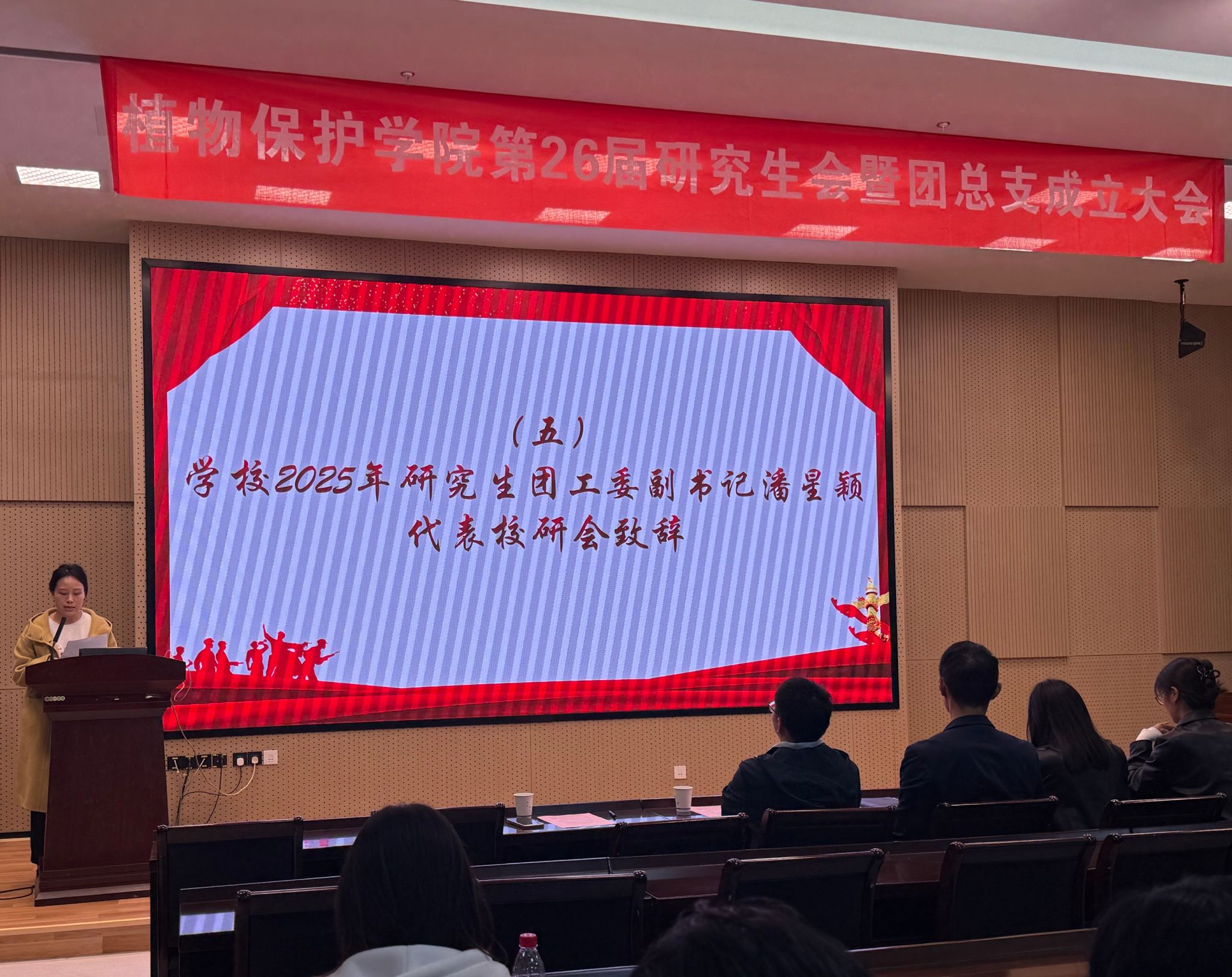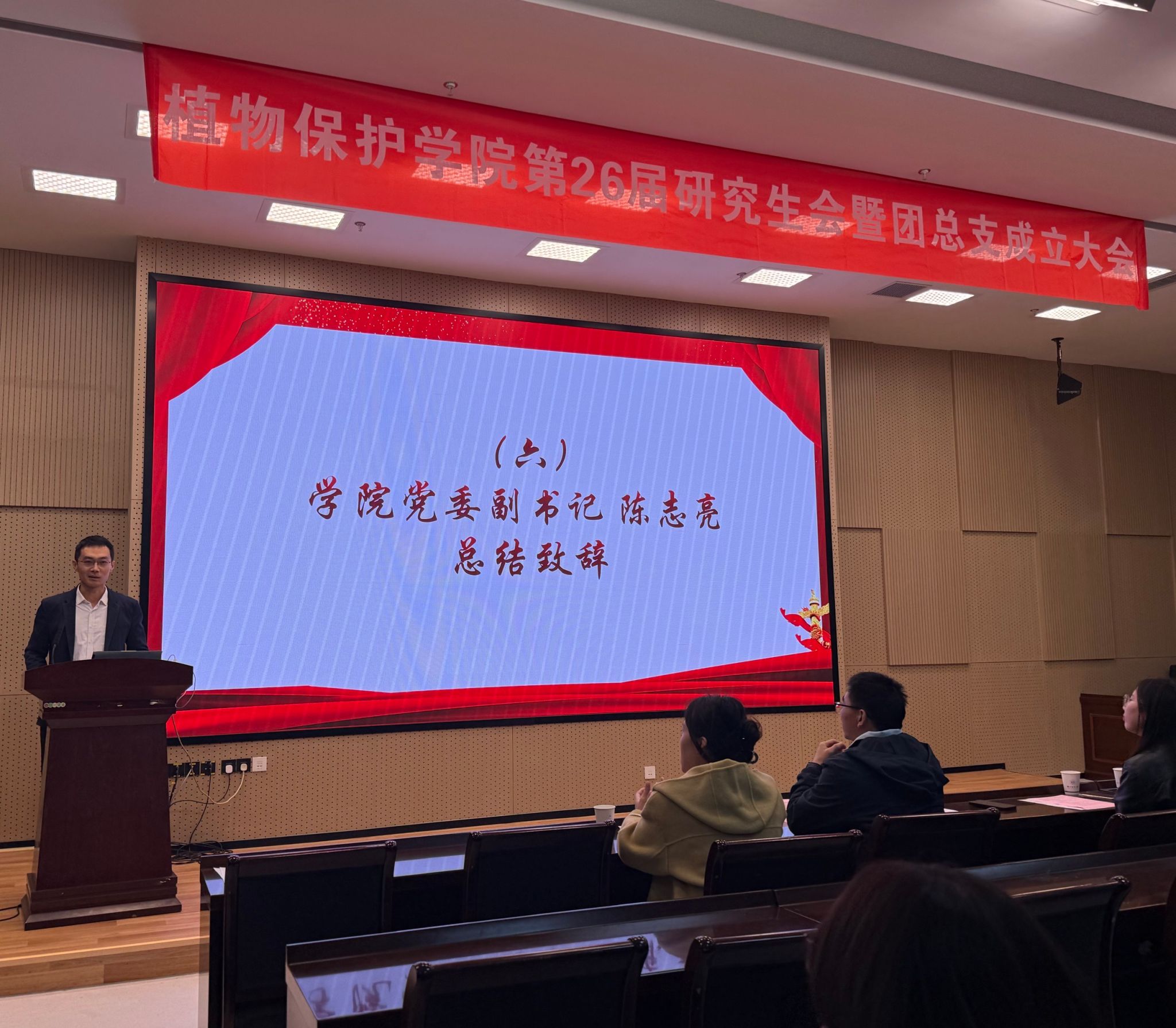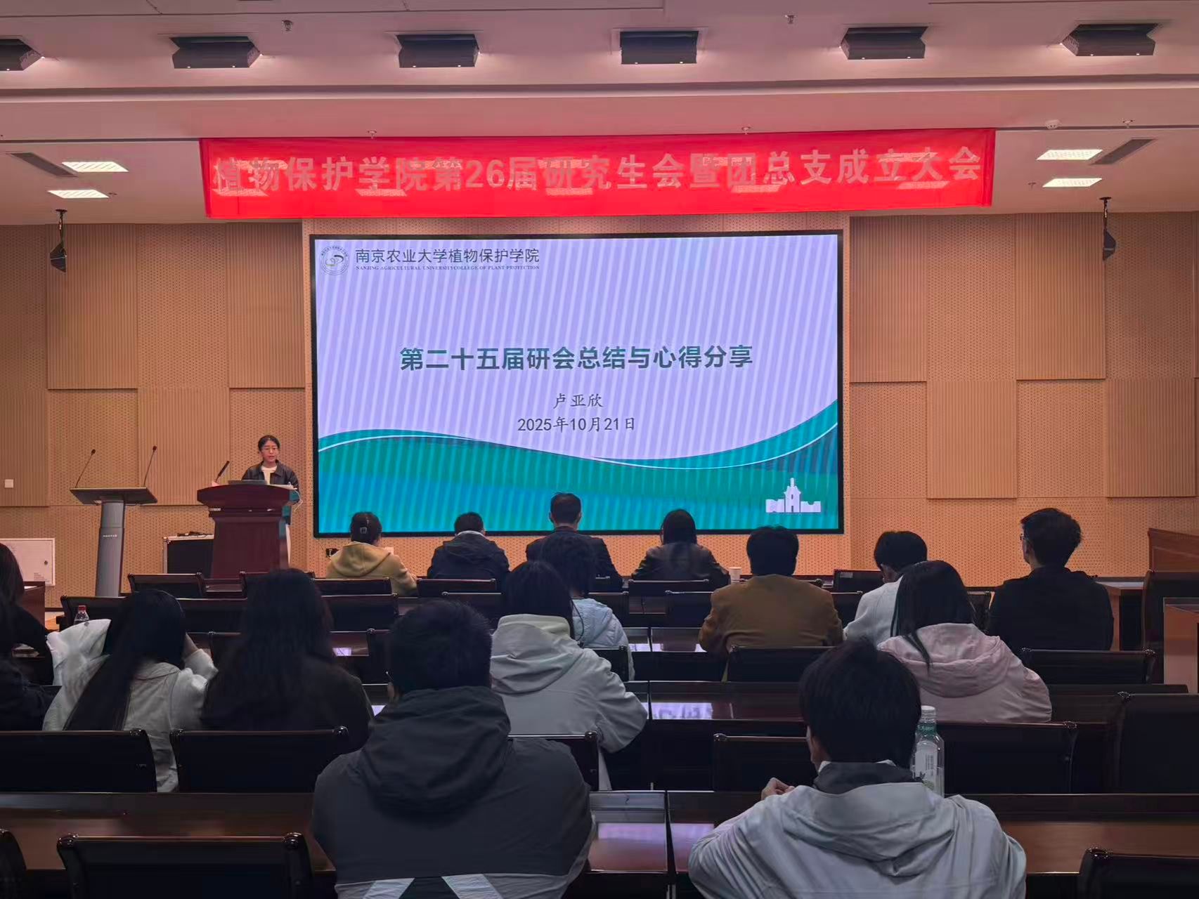 10月21日下午,植物保护学院在21号楼114会议室召开第26届研究生会暨团总支成立大会。学院党委副书记陈志亮,研究生辅导员罗舜文、鞠然然,校研究生团工委副书记潘星颖,学院第25届研分会执行主席卢亚欣出席会议,学院第26届研分会全体成员、2025级研究生新生班长和团支书参加了会议,会议由学院第26届研分会办公室干事周锦鸿主持。