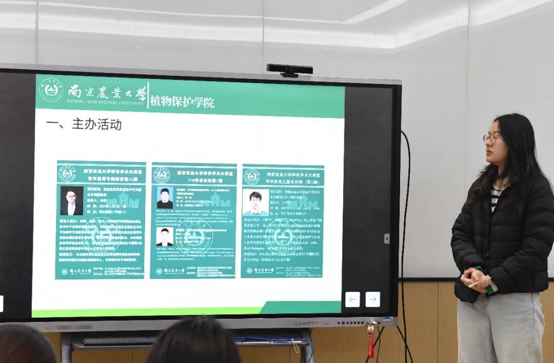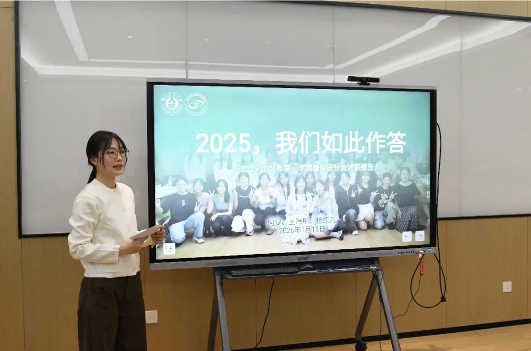 主席团成员何雯进行工作述职报告。她在回顾2025年工作时提到,本学期植保院研分会共举办活动30余场,覆盖师生500余人次,在延续14项品牌活动的基础上,还推出2项创新活动;展望2026年,她表示植保院研分会将继续秉持初心,深化服务,锐意进取,与全体植保学子一道,在学术上攀登,在生活中共建,在成长中互助。