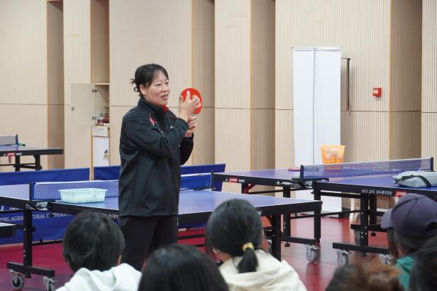 在知识分享与基础技能教学环节,乒乓球国际裁判、南农乒乓球教师宋崇丽老师的分享堪称“干货盛宴”。宋老师以“赛事规则+装备科普”为核心的知识分享环节,打破了同学们对乒乓运动的“浅层认知”。“很多同学打球只看手感,但其实球拍的材质藏着大学问,球拍的不同面有着不同的性能。”