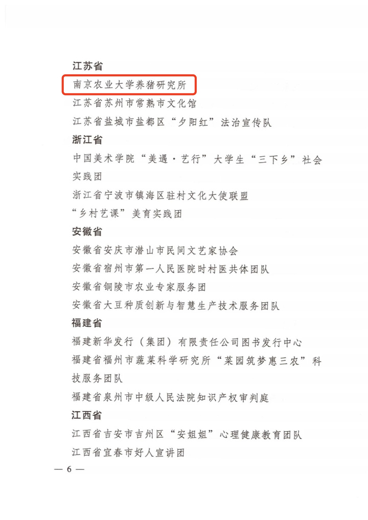 交汇点讯 近日,中央宣传部对在2023年、2024年全国文化科技卫生“三下乡”活动中表现突出的先进集体和个人予以表彰,南京农业大学养猪研究所(以下简称“养猪所”)凭借其在服务“三农”、助力乡村振兴中的卓越贡献,荣获“优秀团队”称号。这一荣誉,是对该团队长久以来扎根产业一线,将先进技术与产业需求紧密结合的理念的肯定。