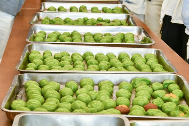 青团制作环节在同学们的欢呼中正式拉开帷幕。在技艺娴熟的食堂师傅们耐心指导下,同学们纷纷撸起袖子,将豆沙、肉松等馅料包裹进面团中,并将包好馅料的青团放在掌心轻轻揉搓,让它们变得更加圆润可爱。他们的手法虽略显生疏,但神情却是认真且专注的。