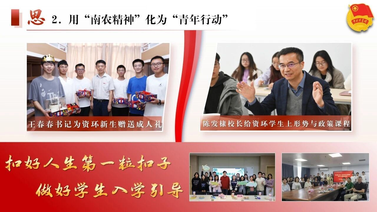 加强团学宣传阵地建设,充分发挥思想引领作用。学院团委邀请王春春书记、陈发棣校长为团员青年讲述好开学第一课,扣好人生第一粒扣子;以“南农资环青年”微信公众号为院团委宣传主阵地,做好宣传解读和政治价值导向,开设各项特辑专栏,共发布推送416篇,收获粉丝9766人,新媒体工作获得省级表彰,真正做到与学生同轨,与时代并进。