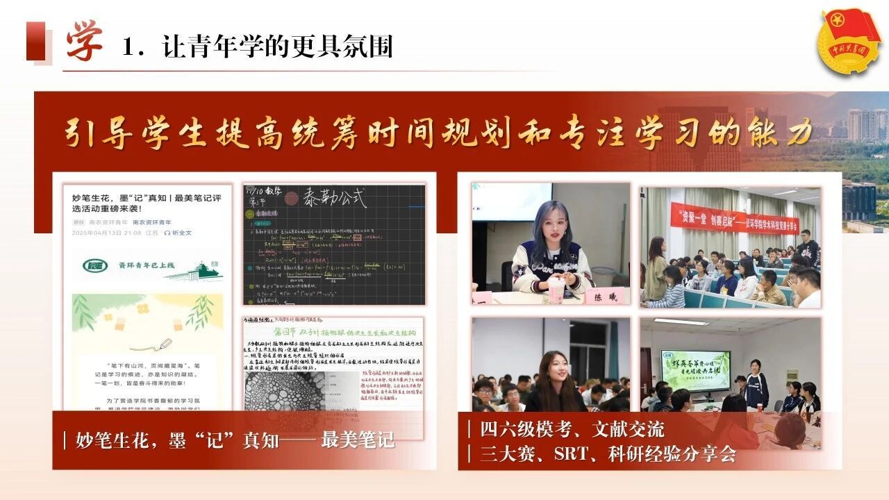 学无止境,青春当燃。学习是青年学生的首要任务,资环学院团委聚焦“学”这一根本任务,全方位各领域助力学生发展。学院团委组织开展最美笔记评选、文献交流分享、主题学术沙龙系列活动,引导学生提高统筹时间规划和专注学习的能力。