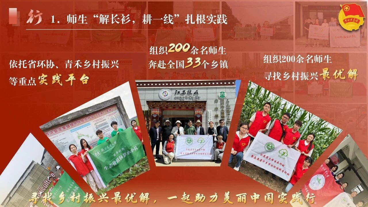 追踪时代热点,打造社会实践品牌。学院团委围绕乡村振兴、生态文明、环保科普等主题板块,让专业理论在社会实践大课堂中生根发芽。200余名师生依托省环协、青禾乡村振兴等实践平台,奔赴西藏拉萨、安徽阜阳、南通如皋、扬州宝应等全国33个乡镇,寻找乡村发展“最优解”,一起助力美丽中国实践行。