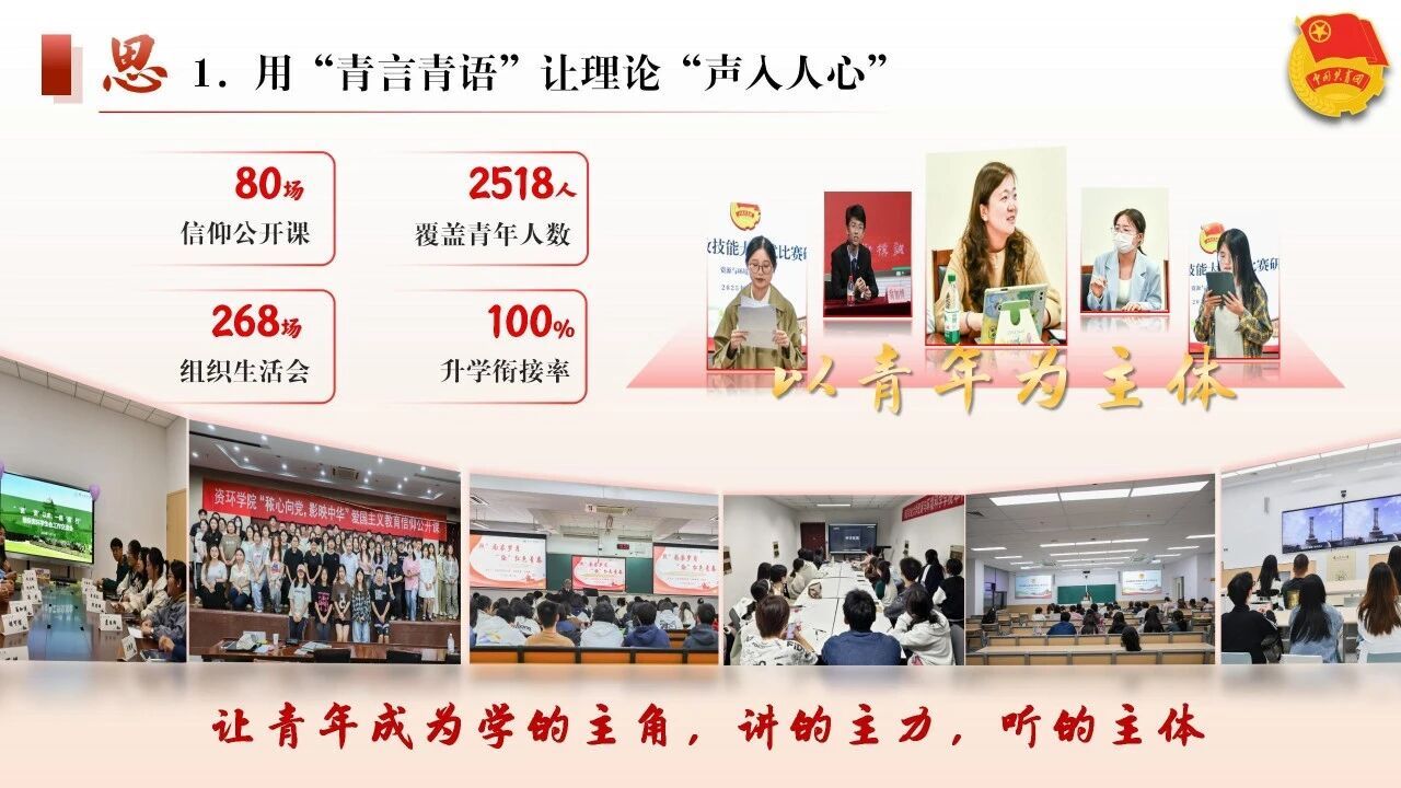 开展学习五四精神系列活动及新时代南农精神大讨论主题系列活动,引领学生厚植爱农情怀,练就兴农本领;以青年喜闻乐见的形式开展80余场信仰公开课,通过组织研讨、团课等形式学习贯彻全会精神,让青年学子深刻领悟和把握全面深化改革的主题,真正做到让青年成为学的主角,讲的主力,听的主体。