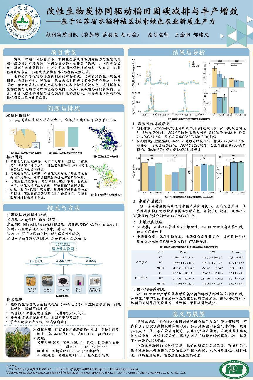 项目名称:改性生物炭协同驱动稻田固碳减排与丰产增效——基于江苏省水稻种植区探索绿色农业新质生产力