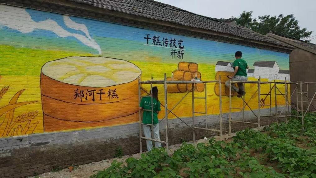 接着队员们调配环保颜料、清洁墙面,将乡土主题的生态图案呈现于村舍之间,生动呈现了青年学子与乡村共建生态美学的实践场景。