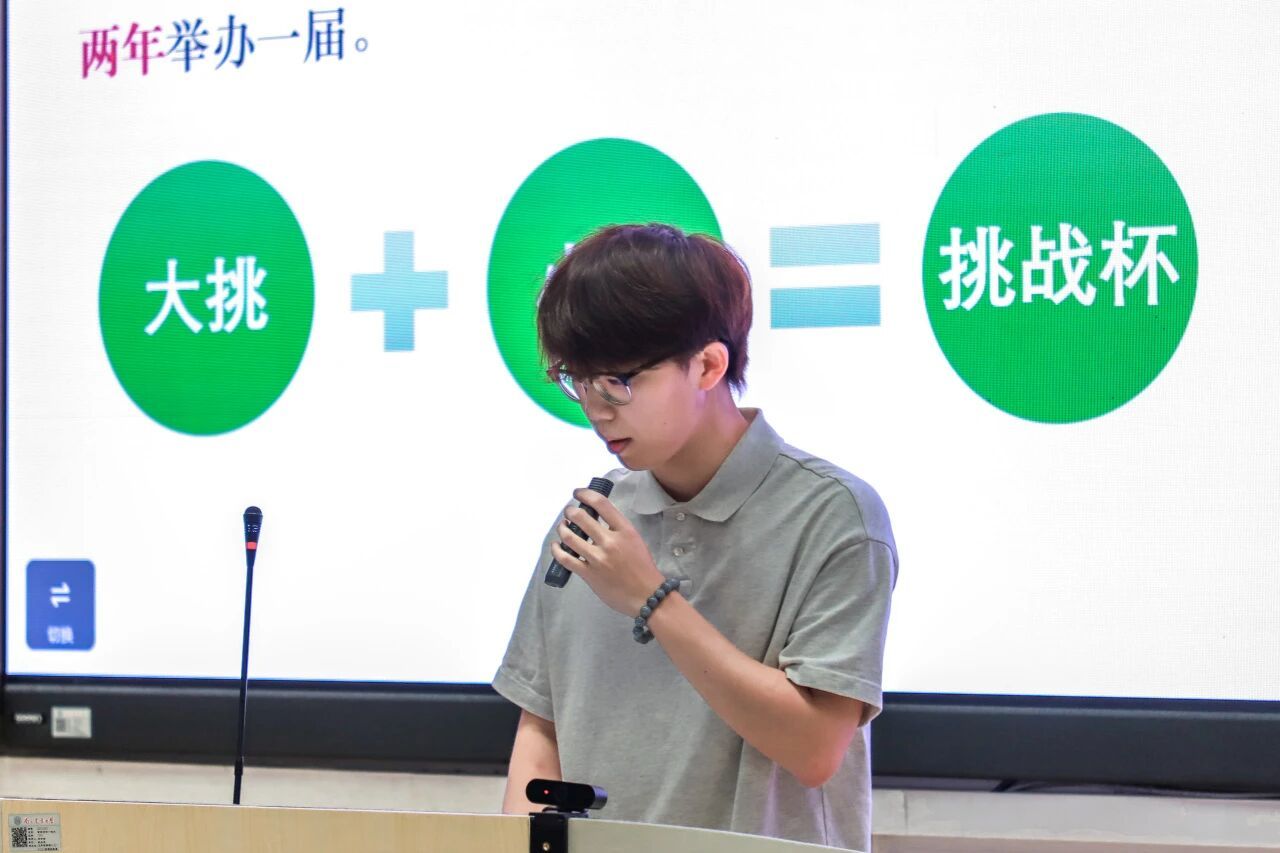 首先,科创部的夏一鸣对三大赛进行了详细介绍。他从三个比赛的赛事概况、作品类型、项目要求等方面分别展开讲解,同时也强调了“挑战杯“系列赛事的区别,让同学们初步理解三大赛的情况。