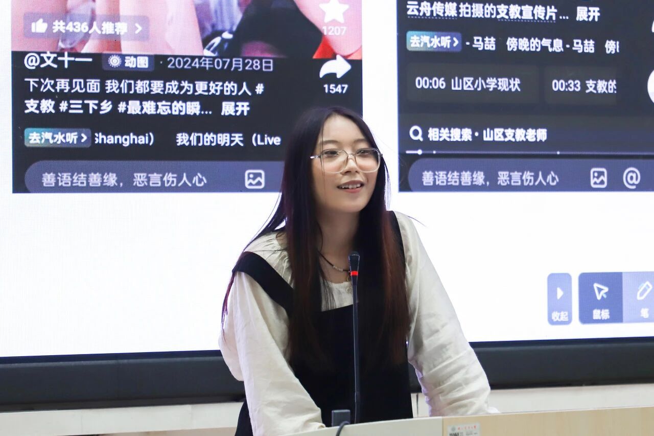 随后,资环232班王玫秀同学讲述了她勇敢报名参加了《全世界的水都会重逢》线下支教项目,在偏远乡村度过了难忘的半个月。白天授课,夜晚备课,与孩子们朝夕相处的日子里,她不仅传递了知识,更收获了沟通能力的增强和自我成长。分享时她从为什么选择支教切入,从支教的地理位置,到对特色课程设计的心得,还有让人印象深刻的小朋友之间的故事,让人十分感动。王玫秀同学的经历让她更加坚定了继续投身支教事业的决心,也激发了更多人对支教事业的向往与热情。