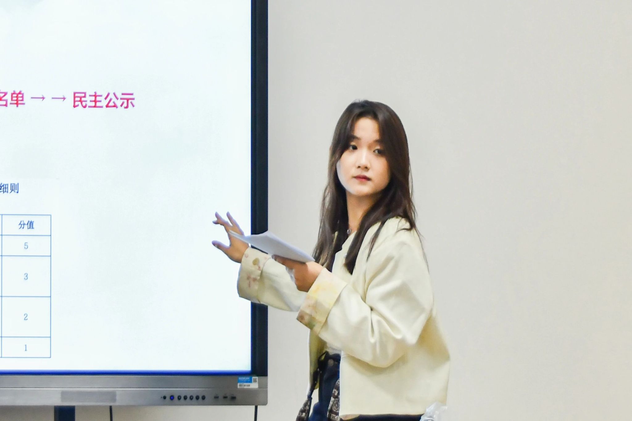 组织部干事尤诗雯、陈菡围绕先锋支部立项书的格式规范、内容书写和文件提交三方面进行了详细讲解。通过案例分析,她们重点剖析了格式规范的要点,通过与团干部们的积极互动,进一步引导大家深入思考立项书填写中的注意事项,为各班支提供了宝贵的填写参考。接着两位干事从团员发展流程的框架入手,结合入团申请资料细化讲解了入团积极分子评选、发展对象的确定、新发展团员三个阶段的注意事项,帮助同学们深入了解团员发展的流程。