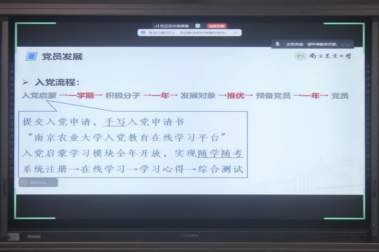 会议伊始,李天骄老师分享了资环学院党员发展流程。他强调加入伟大的中国共产党是光荣而神圣的,志愿加入党组织的同学更应该加强理论学习,提高政治站位,加强作风建设。