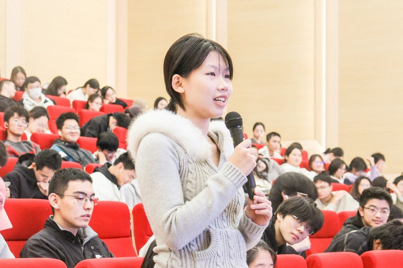 在互动交流环节,在场同学热情高涨,抛出了“大一阶段应重点锤炼哪些品质以夯实学术科研基础?”“如何破局‘生化环材’就业困境、找准职业方向?”等现实关切的问题。
