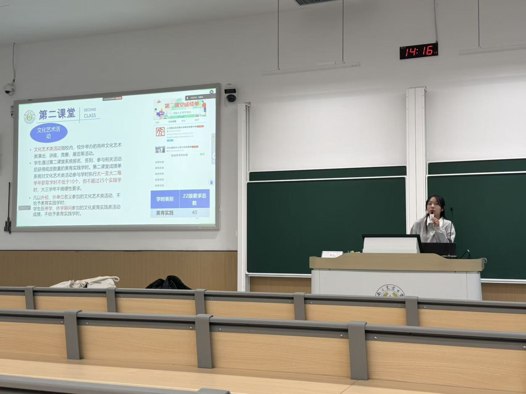 韩冉进行第二课堂相关内容讲解,她结合自身本科阶段的实践经历以及辅导员阶段的工作经验,清晰说明第二课堂学分与毕业要求的关联,详细介绍学术讲座、志愿公益、学科竞赛、文化活动等学分获取途径,现场演示第二课堂管理系统的报名、签到、学分认定等操作流程。她特别提醒同学们合理平衡学业与第二课堂,避免盲目参与,建议根据个人发展规划选择适配的活动,确保学分获取更具针对性与实效性。