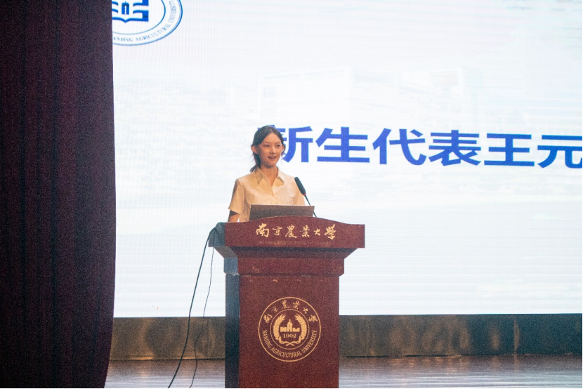 2025级新生代表王元睿发言,对接下来的校园生活表示憧憬,借用“一颗种子”、“一片土地”、“一个信念”三个关键词,阐述了自己对南农学子责任与担当的理解,表达了在校园蓬勃发展的殷切渴望,传递了未来服务国家和人民的宏伟追求。同时呼吁同学们不忘初心、奋勇前进。
