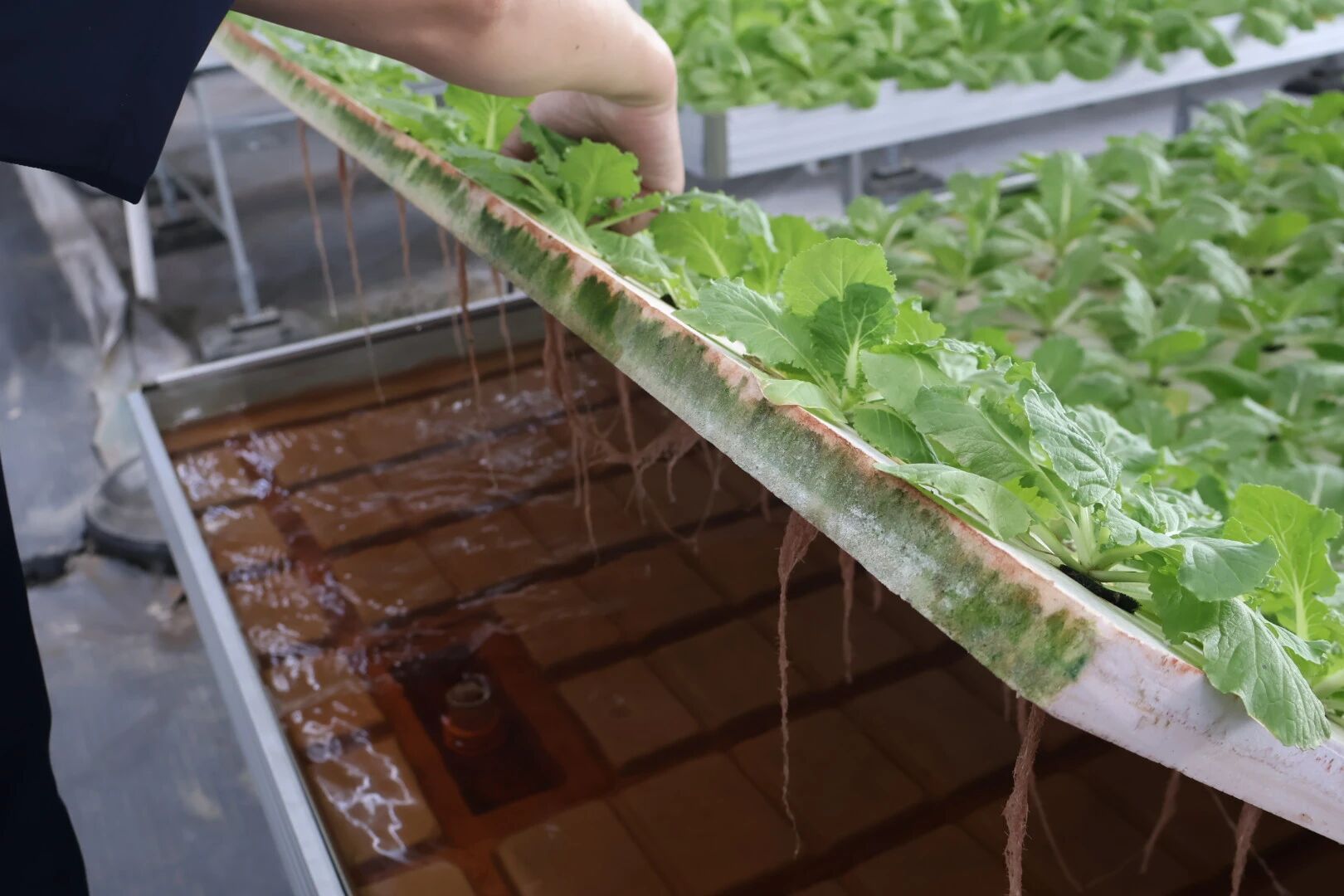 随后参观联动棚,观察到棚内采用水培和无土栽培技术种植的黄瓜、上海青、观赏番茄等作物,根系发达、果实饱满。团队成员查看了水溶肥的配比设备和滴灌系统,了解到系统可根据植物不同生长阶段自动调整施肥量和频率。