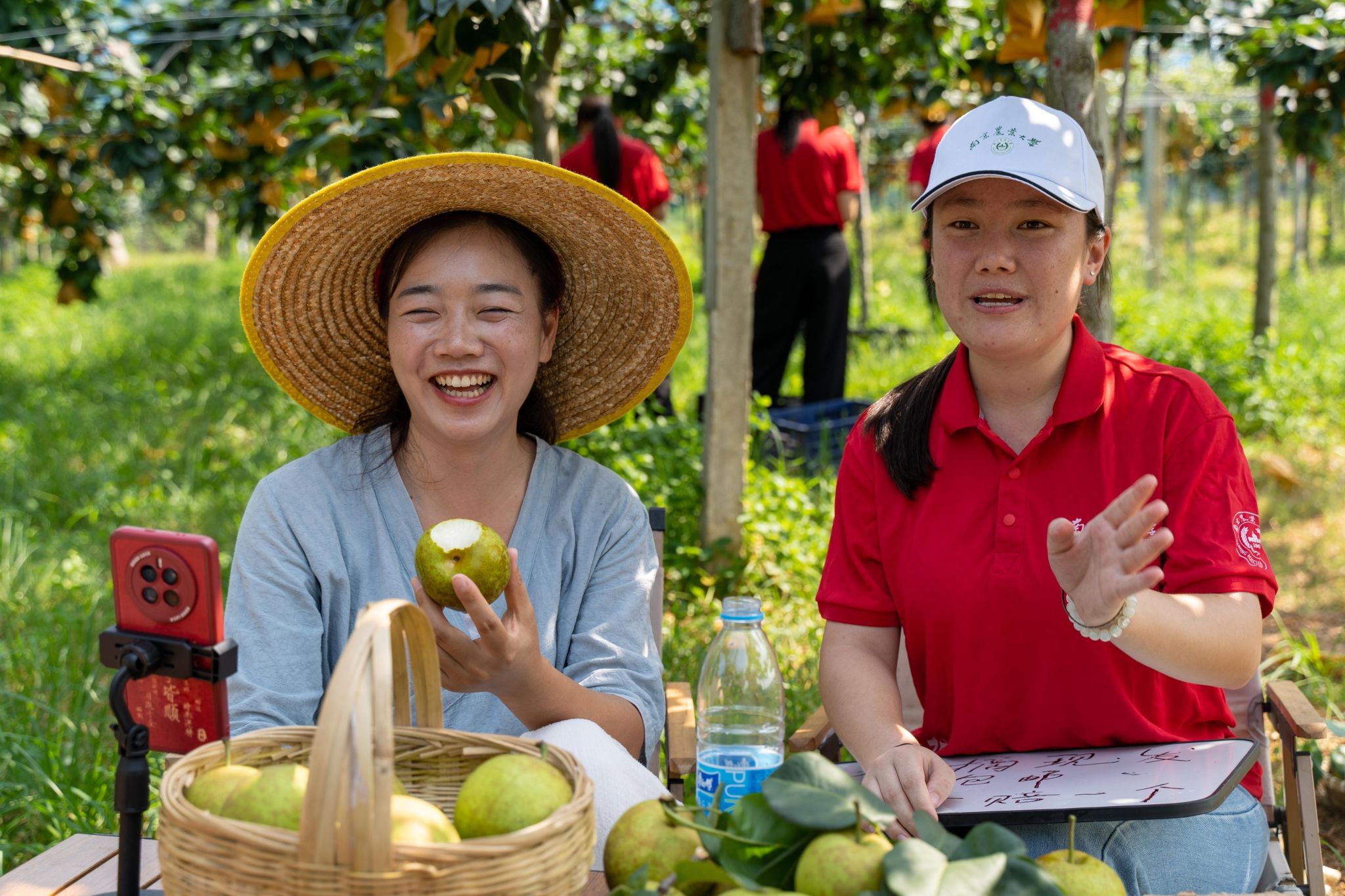 “家人们看过来!这颗翠冠梨咬下去‘咔嚓’一声,汁水直接飙出来,甜度高达14度,比普通梨甜3个度!”镜头前,实践团成员顾雨彤举着刚摘下的翠冠梨,一口咬下,晶莹的汁水顺着果核流下,瞬间点燃了网友的兴趣。