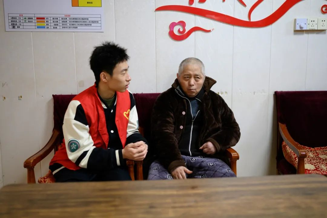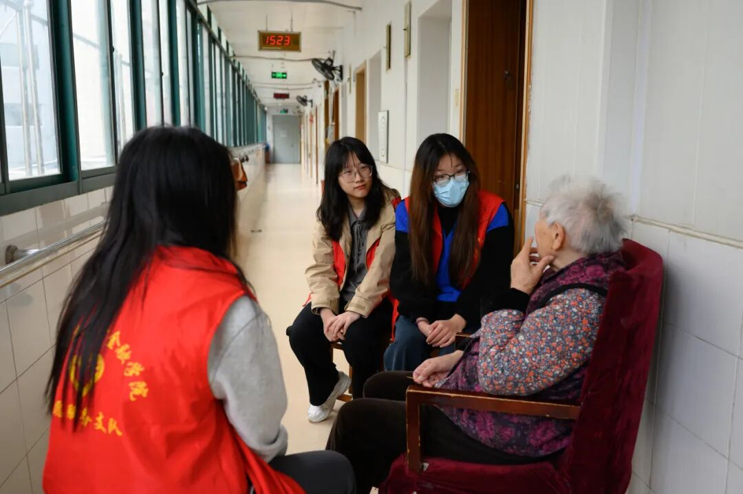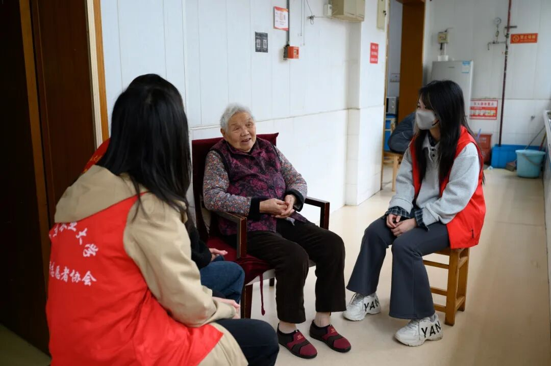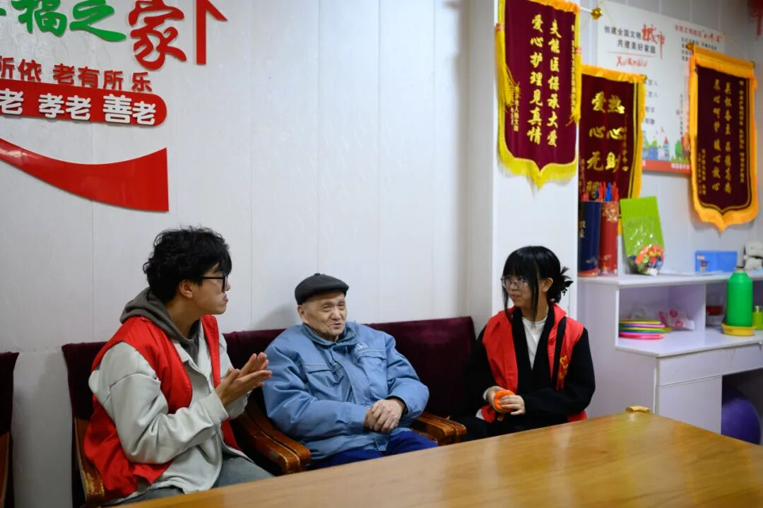 午后三时,志愿者们准时抵达梅园街道老年照料中心,他们迅速分组,分别前往一、二楼探望老人们。在与老人交谈的过程中,志愿者们全神贯注,侧耳倾听老人们讲述那些被岁月尘封的回忆。他们时而微微颔首,用眼神传递着理解与共情,流露出真挚的关怀。老人们在志愿者们的陪伴下,脸上渐渐绽放出久违的笑容,仿佛找到了能够分享往昔故事的知音,整个过程充满了温馨和谐的氛围,仿佛一股暖流在照料中心内流淌。