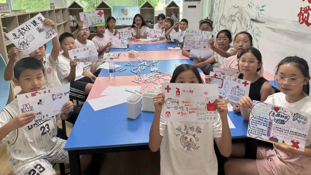 比赛分为多个环节,涵盖知识问答、情景包扎与手抄报创作等内容。在知识抢答环节,志愿者们围绕常见应急场景设计题目,孩子们踊跃举手、积极应答,现场气氛热烈。包扎实操环节中,小朋友在模拟场景下进行头部、手部、手腕等不同部位受伤的包扎演练,志愿者逐一指导并评分,帮助孩子们掌握正确的急救技能。此外,手抄报创作环节让孩子们用画笔大胆创作。大家将急救知识转化为生动图像,加深了对急救要点的理解。