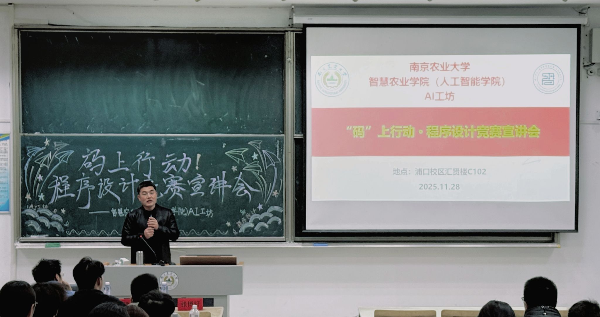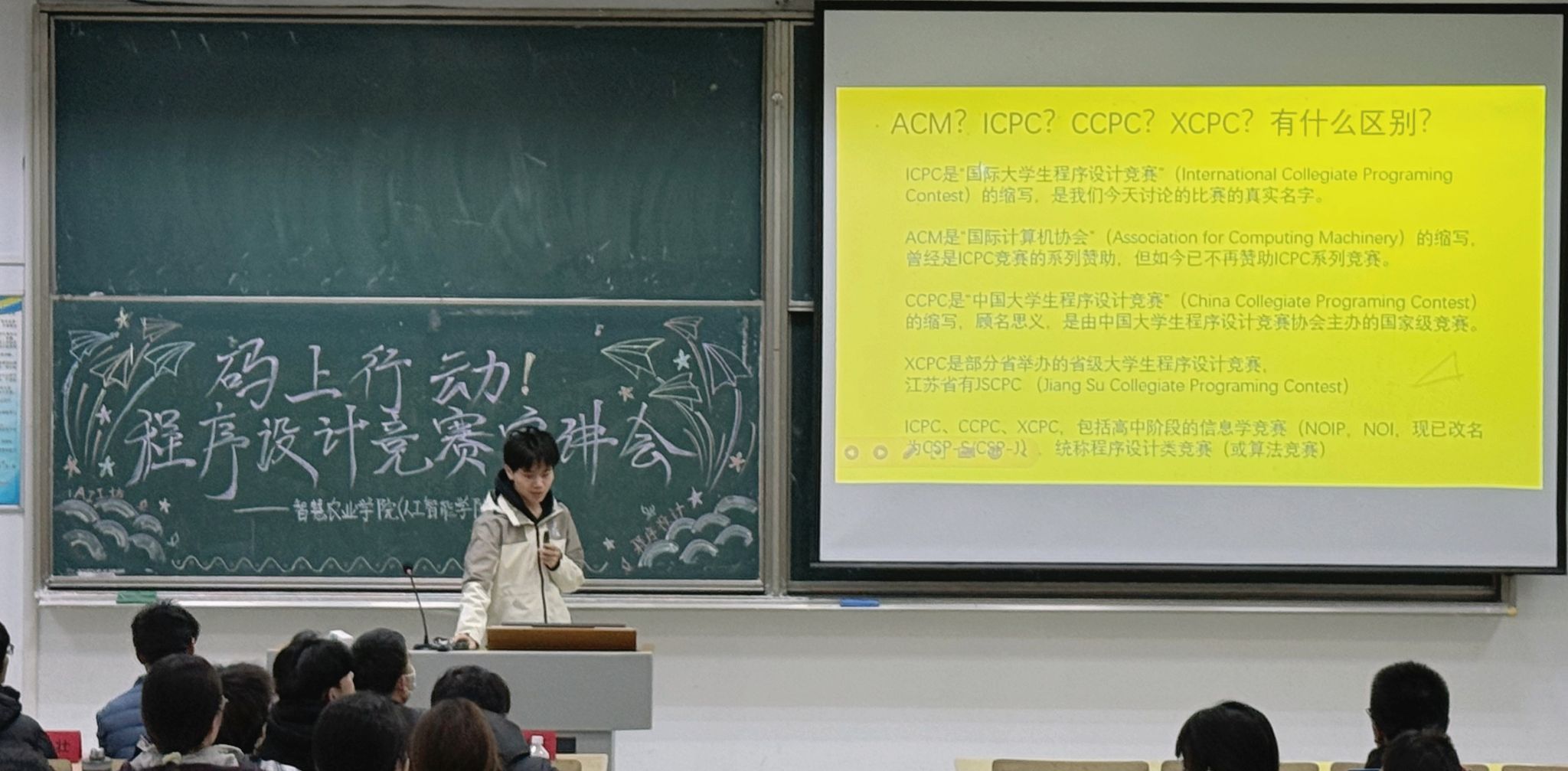 11月28日晚,智慧农业学院(人工智能学院)AI工坊在汇贤楼C102教室成功举办了程序设计竞赛宣讲会。本次宣讲会聚焦ICPC、CCPC、JSCPC及中国高校计算机系列赛之团体程序设计天梯赛(以下简称团体程序设计天梯赛)四类赛事,为编程爱好者搭建了精准的赛事认知与备赛指导平台。