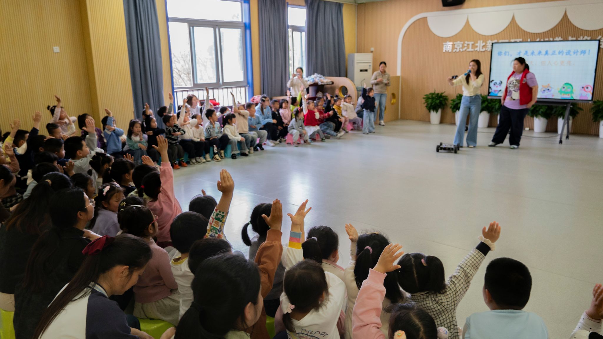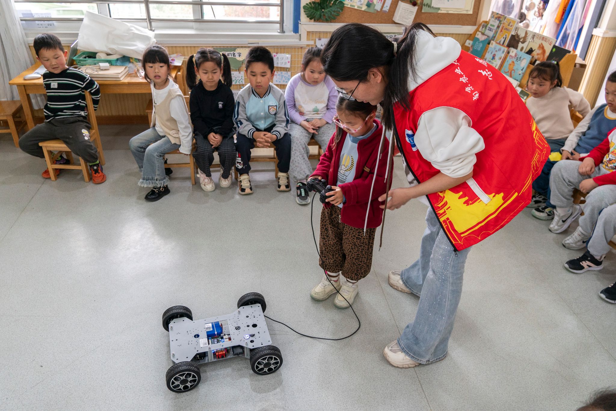 活动当日,志愿者团队提前1小时抵达活动现场,完成场地布置、设备调试等准备工作,以饱满的精神状态迎接孩子们的到来。活动开场的AI主题猜谜游戏迅速点燃全场氛围,孩子们纷纷举手抢答,现场气氛热烈;科普小课堂环节,志愿者们以动画短片、日常AI产品举例等形式,用童趣化的语言讲解人工智能的基础概念,高频互动引导孩子们主动思考;核心实操环节中,志愿者们带来学院学生自主研发的机器人小车教具,手把手引导小朋友们操作小车完成前进、转向等动作,耐心讲解简单的设计原理,当看到亲手操控的小车灵活移动时,孩子们纷纷发出惊喜的欢呼,在沉浸式的实操体验中直观感受科技的乐趣。整场活动在轻松温馨的氛围中圆满结束,得到了园方老师的一致好评。
